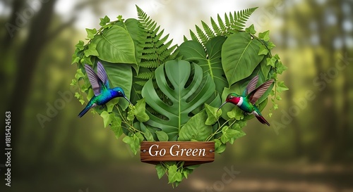 © Subrata, Naklejka premium Heart Shaped Greenery with Hummingbirds and Go Green Sign leaves vines