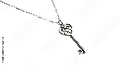 © Shameem, Fototapeta premium Heart shaped key pendant on silver chain isolated on white background