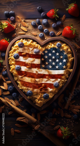 Fototapeta premium Heart-shaped pasta with blueberries and strawberries in the colors of the American flag.