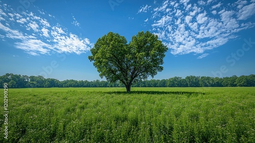 © arsyi_06, Obraz premium Heart-shaped tree in green field, forest background, sunny sky, for eco projects
