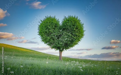 Obraz premium Heart-Shaped Tree of Love: A majestic tree, sculpted by nature, stands proudly in the heart of a green field. Its branches intertwine to form a perfect heart shape.