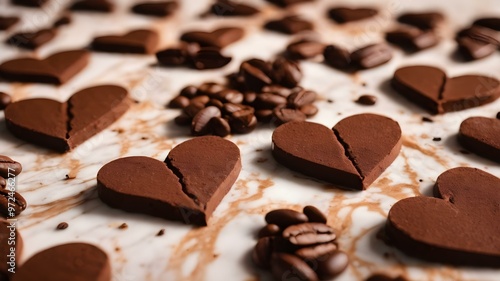 Fototapeta premium Heart shapes made from powdered chocolate on a marble slab with coffee beans...