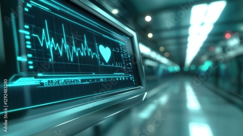 © krit, Obraz premium Heartbeat monitoring system display in high-tech medical environment