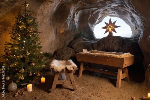 © Michael, Fototapeta premium Heartfelt Christmas Scene: Old Wooden Manger and Star of Bethlehem in a Sacred Cave
