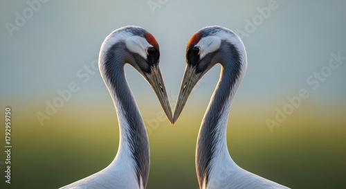 © aminsmart, Obraz premium Heartfelt crane pair creating a lovely intimate moment in nature capturing avian affection