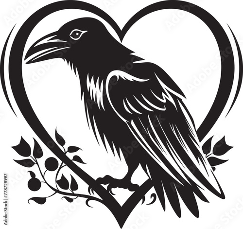 Fototapeta premium Heartfelt Guardian Raven Perched Vector Logo Wings of Affection Raven on Heart Symbol Logo
