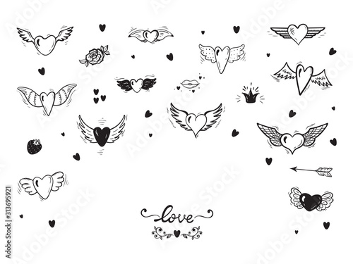 Naklejka premium Hearts with Wings for Valentines Day or Wedding greeting cards. Love Vector Set. Beautiful Doodle Heart tattoo. Hand drawn illustration