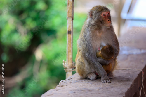 © 大爷 倪, Fototapeta premium Heartwarming Moment of a Mother Monkey Embracing Her Baby
