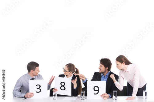 © BlueSkyImages, Obraz premium heated teamwork and discussion in group of four.