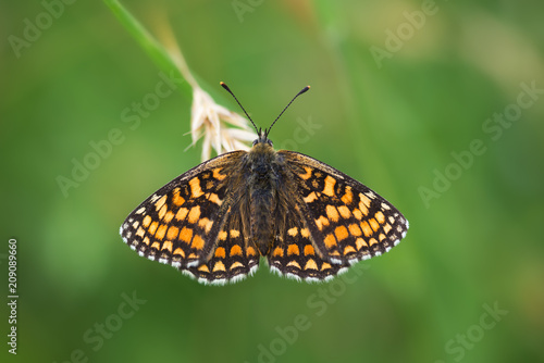 © stevie_uk, Fototapeta premium Heath Fritillary on grass seed head, Luckett, Cornwall, UK