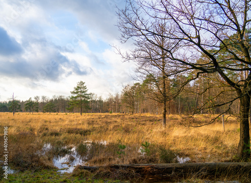 Fototapeta premium Heath landscape in winter in Netherlands with pools of water