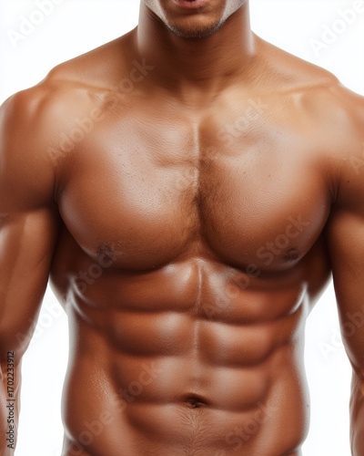 © MaleModels.AI, Fototapeta premium Heavily muscular male torso with defined pectoral muscles and six-pack abs