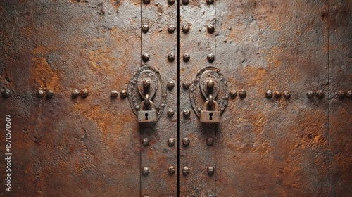 Fototapeta premium Heavily weathered, rusty metal double doors secured with padlocks and studded
