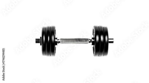 Fototapeta premium Heavy black adjustable dumbbell featuring multiple dark weight plates and a textured silver grip handle isolate