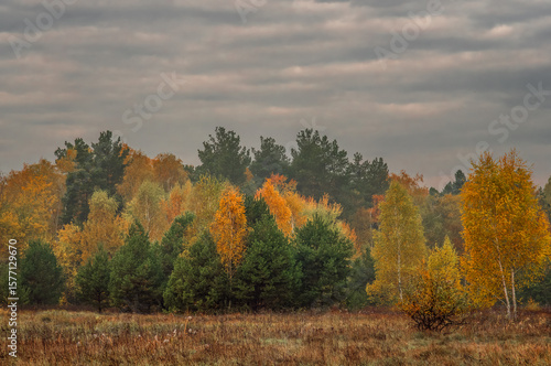 © Mykhailo, Fototapeta premium Heavy clouds hung over the autumn forest and meadow.