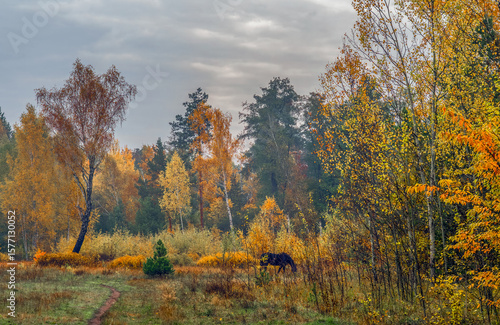 © Mykhailo, Fototapeta premium Heavy clouds hung over the autumn forest and meadow.