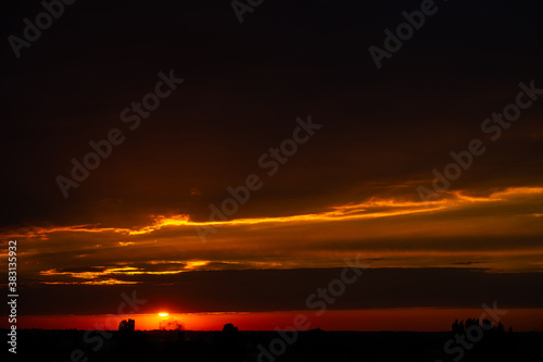 Fototapeta premium Heavy cloudy sky at sunset. Orange line of light between black clouds. A landscape of beautiful nature