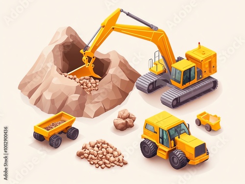 © JT-Dee, Obraz premium Heavy construction machinery including excavator, dump truck, bulldozer and wheel loader in action, white isolated background