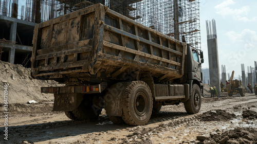 © Gun, Obraz premium Heavy Dirt-Loaded Truck Navigates Muddy Construction Site Under Clear Blue Sky
