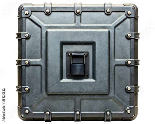 Fototapeta premium Heavy-duty black plastic equipment case with a padlock on a transparent...