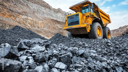 Obraz premium Heavy-duty dump truck transporting coal in a mining site against a rugged...