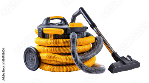© Wicha1, Obraz premium Heavy-duty vacuum cleaner hose coiled beside main unit background isolated on a Transparent background, PNG file.