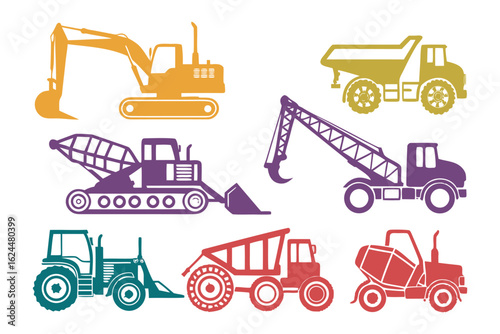 Naklejka premium Heavy Machinery Icons: A collection of colorful heavy machinery icons, ideal for illustrating construction and industrial concepts. Each vehicle is depicted in a vibrant and bold.