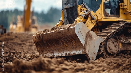 © aubriella, Fototapeta premium Heavy machinery operator driving a bulldozer on a construction site. Featuring power and control