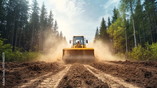 Fototapeta premium Heavy machinery working on a construction site in a forest clearing, creating dust and transforming the landscape under a blue sky with sunlight and trees