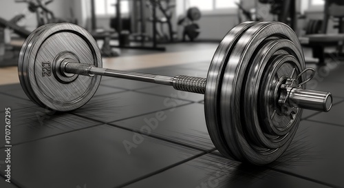 © Farid Nisuki, Naklejka premium Heavy Metal Barbell with Weight Plates on Gym Floor in Fitness Studio