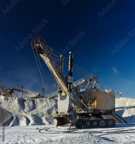 Obraz premium Heavy quarry excavator against the background of dark blue sky in a winter sunny day, panorama.