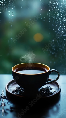 © velvokayd, Fototapeta premium Heavy rain falls outside, illuminating the rich tea in a teacup resting on a dark, textured surface.
