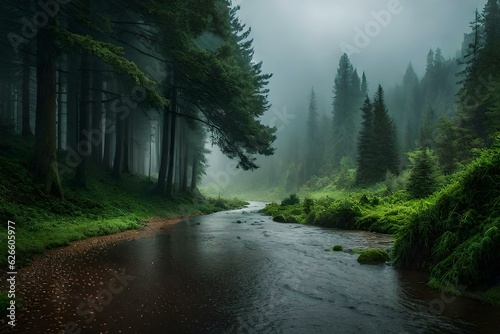 © ellon, Obraz premium heavy rain in forest generative by AI technology