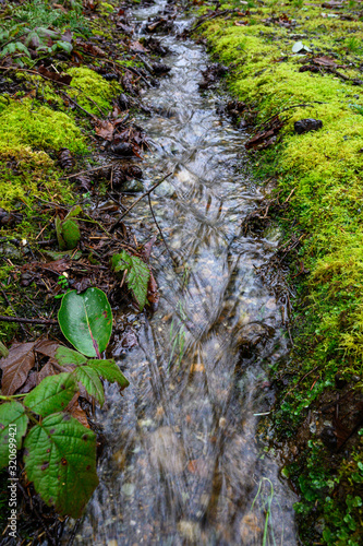 © knelson20, Fototapeta premium Heavy rain runoff through vibrant green moss, winter day