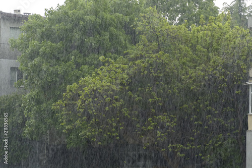 Obraz premium Heavy rain ,vertical drops against trees in the background.