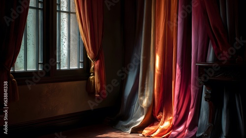Fototapeta premium 90. Heavy satin curtains in deep celebratory hues flowing by window