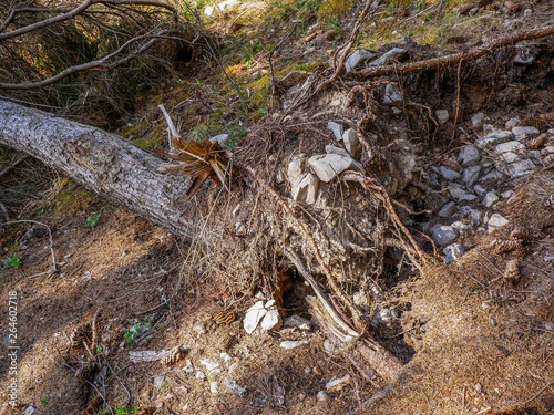 Obraz premium Heavy storm twisting the pine tree roots out of the ground .