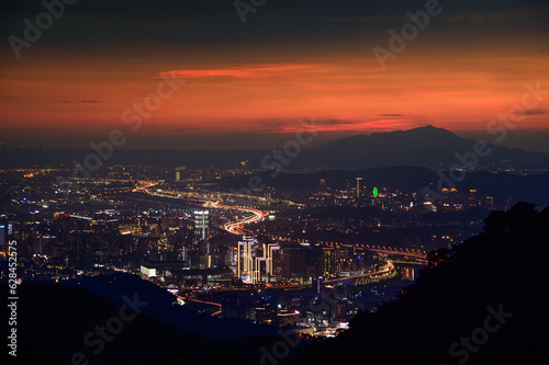 Obraz premium Heavy traffic in the city, time-lapse photography of car lights. View of the urban landscape from Dajianshan Mountain, New Taipei City.