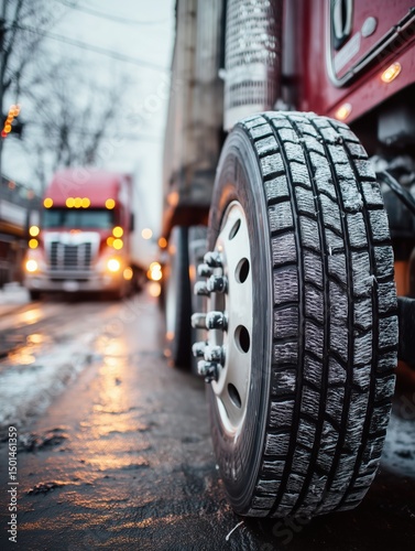 Naklejka premium Heavy Truck Wheel Coated in Slush and Snow