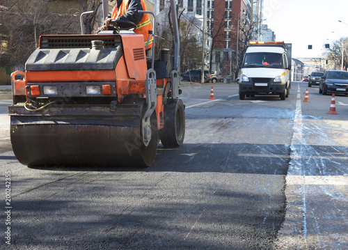 © Sergii, Obraz premium Heavy Vibration roller compactor at asphalt pavement works for road repairing