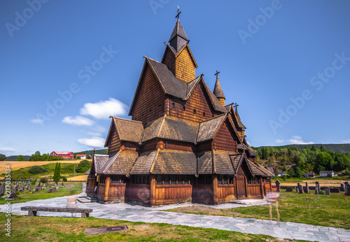 © rpbmedia, Fototapeta premium Heddal - August 01, 2018: Medieval Heddal stave church, the largest of the remaining stave churches in Telemark, Norway