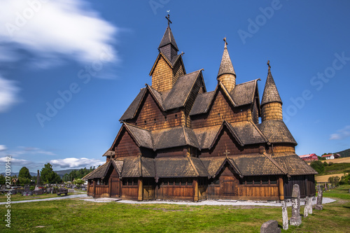 Fototapeta premium Heddal - August 01, 2018: Medieval Heddal stave church, the largest of the...