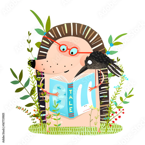 Fototapeta premium Hedgehog and Crow Friends Reading Book