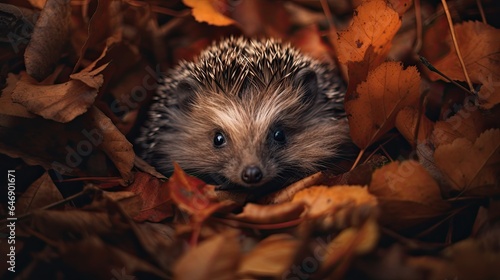 Naklejka premium Hedgehog curled up in a bed of fallen leaves, showcasing seasonal adaptation