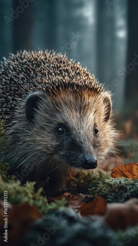 © Georg, Fototapeta premium Hedgehog exploring a forest floor covered in leaves during early morning light in a serene woodland setting