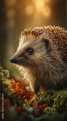 © Georg, Fototapeta premium Hedgehog foraging in a sunlit forest