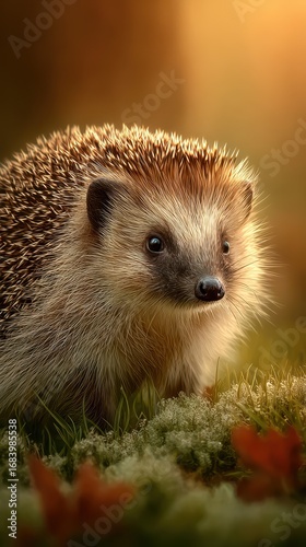 © Michael, Fototapeta premium Hedgehog foraging in a sunlit meadow during golden hour surrounded by autumn foliage