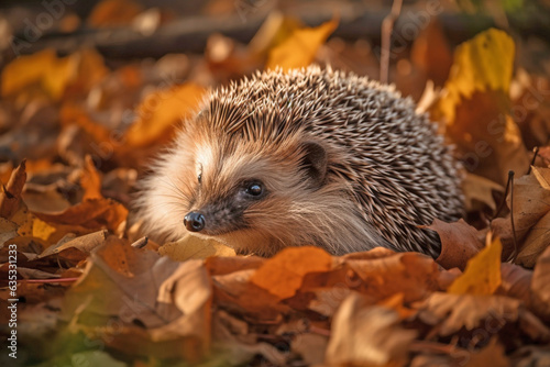 © Firn, Fototapeta premium Hedgehog in forest with colorful autumn leaves