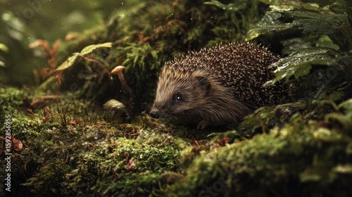 © Elvira, Naklejka premium Hedgehog in lush green forest underbrush with dewy moss and leaves