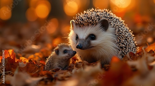 Fototapeta premium Hedgehog mother and baby in autumn leaves